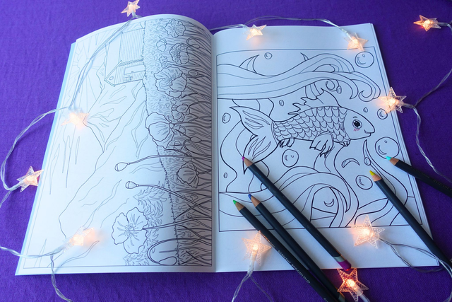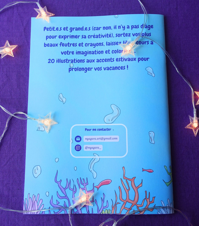 Livre format A4 contenant 20 coloriages originaux sur le thème de la fantaisie et de l'été. Il peut convenir à des personnes de tout âge car la difficulté des dessins varie, certains sont très simples quand d'autres sont beaucoup plus complexes, arborant de nombreux détails.